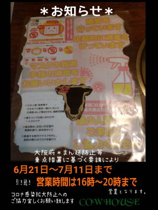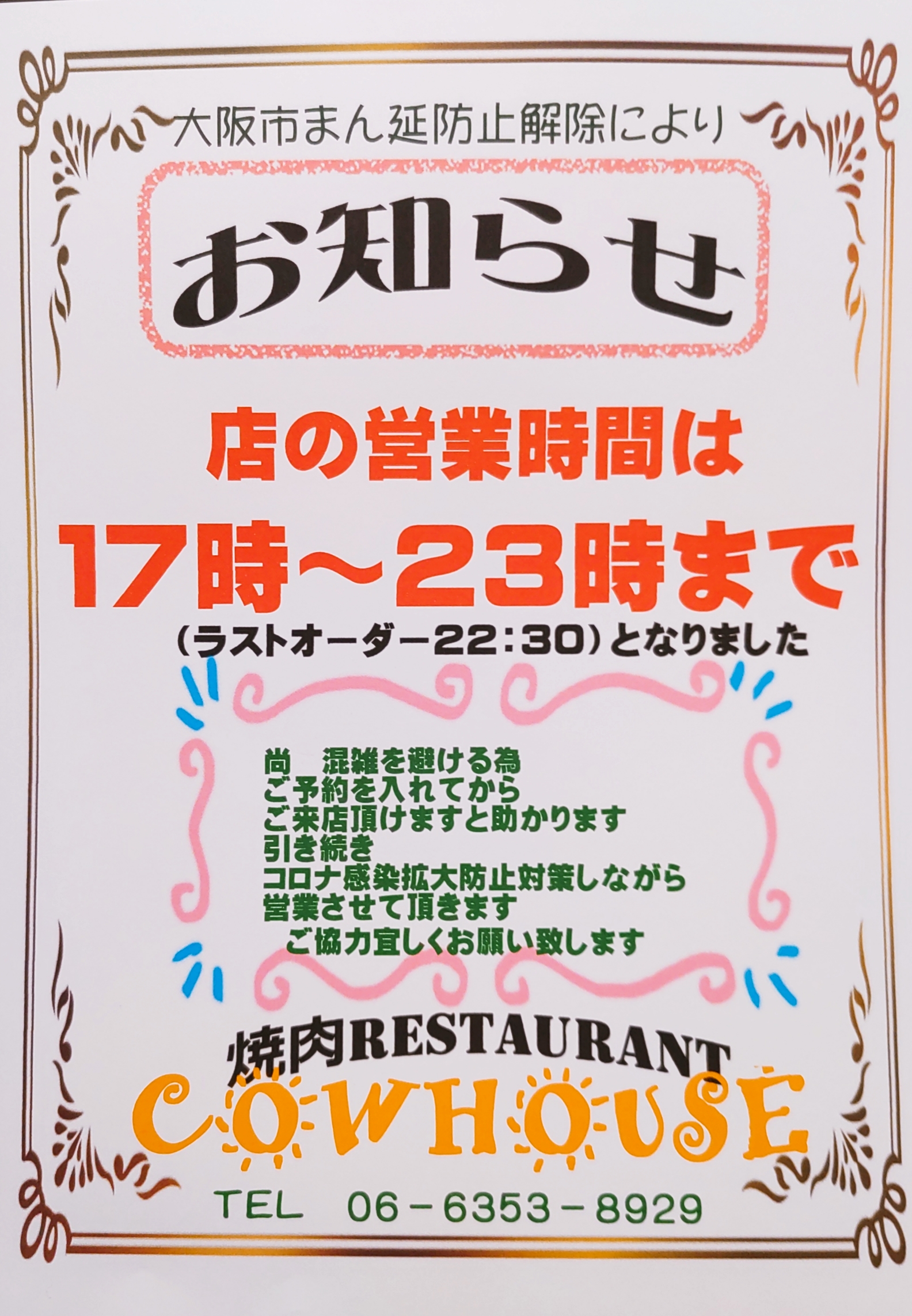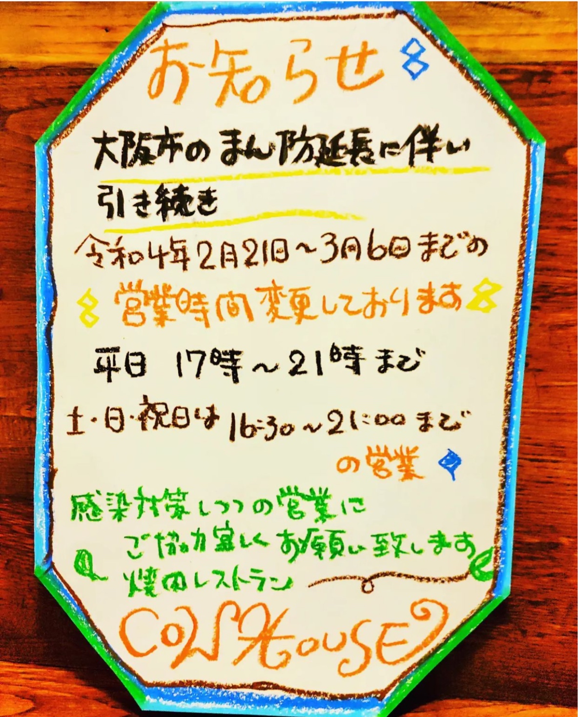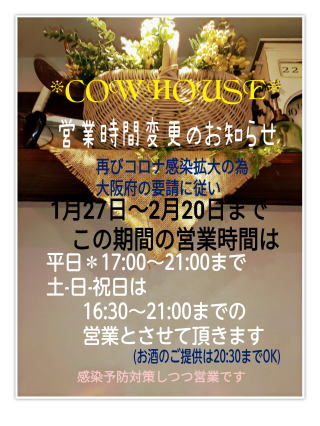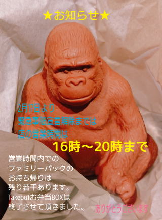 営業時間変更のお知らせ これまでの大阪市の時短営業協力に従い (2月16日よりお昼の営業は終了させて頂きました) 引き続き 店内での営業時間は20時まで営業とさせて頂きます *今度も大阪市の要請に従い営業致します。 大変ご迷惑おかけ致しますが宣くお願い致します*