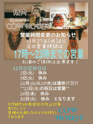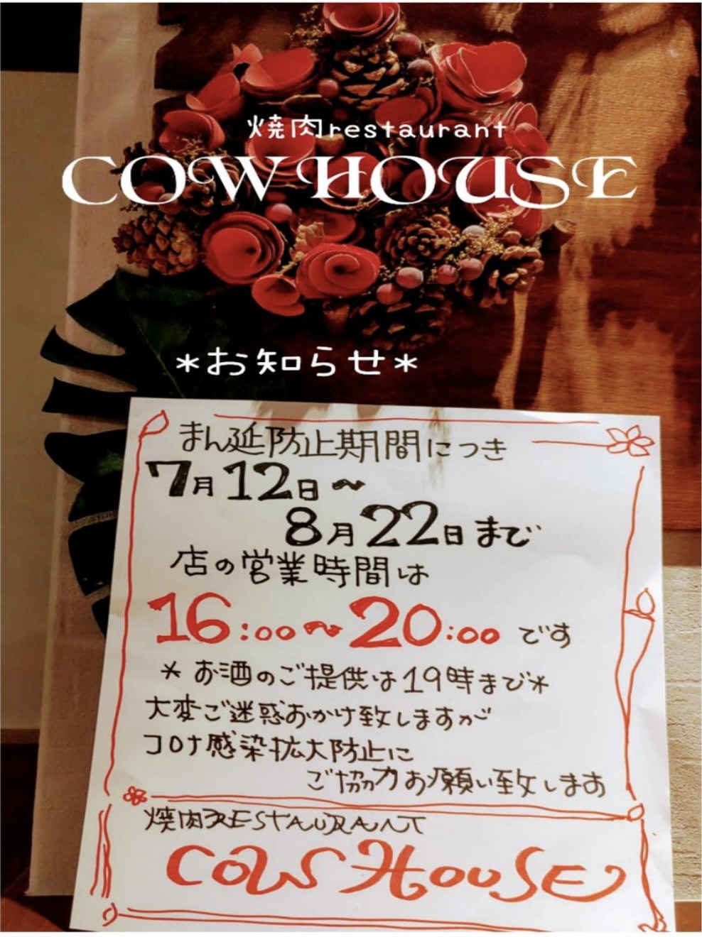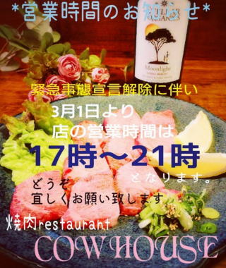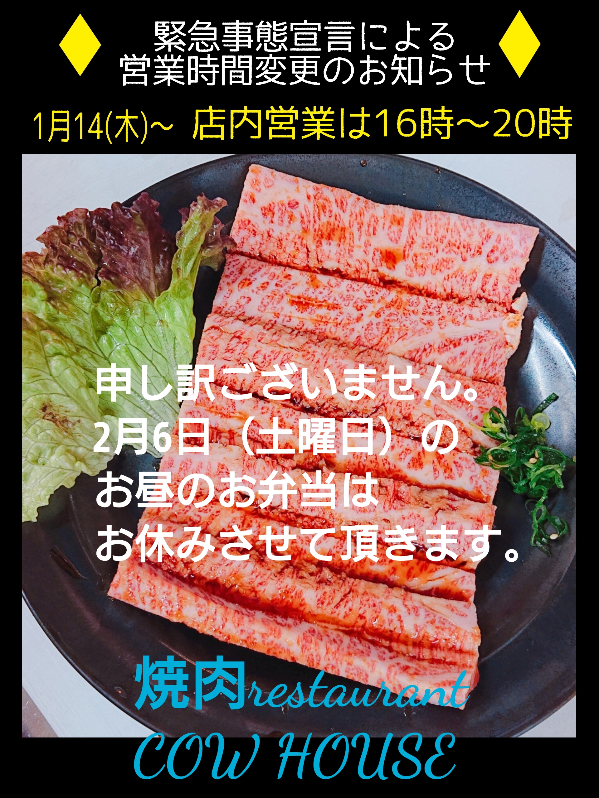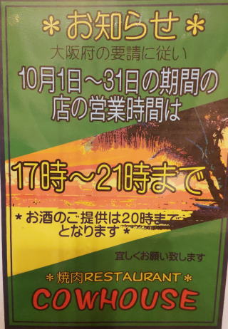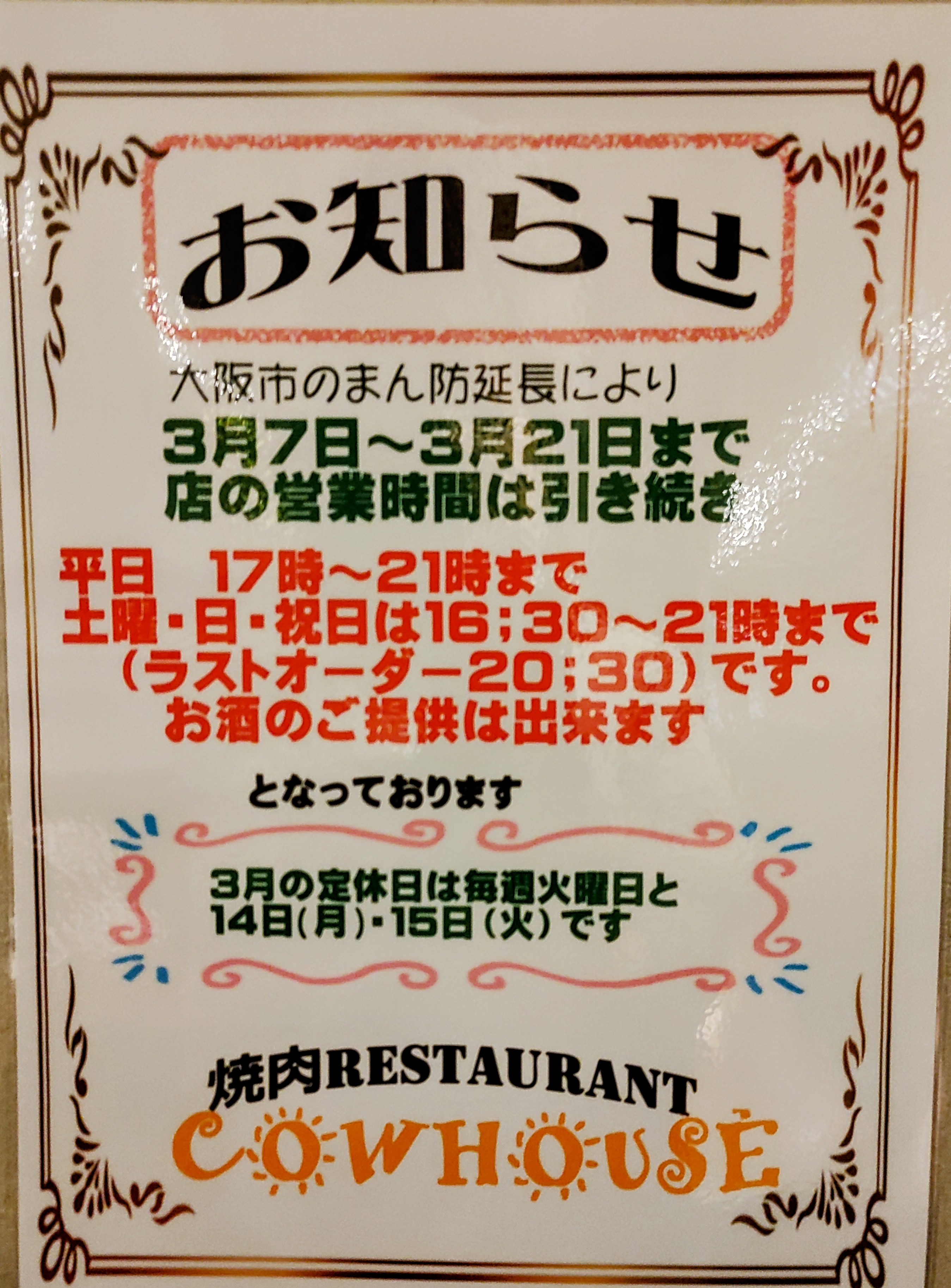 営業時間変更のお知らせ これまでの大阪市の時短営業協力に従い (2月16日よりお昼の営業は終了させて頂きました) 引き続き 店内での営業時間は20時まで営業とさせて頂きます *今度も大阪市の要請に従い営業致します。 大変ご迷惑おかけ致しますが宣くお願い致します*